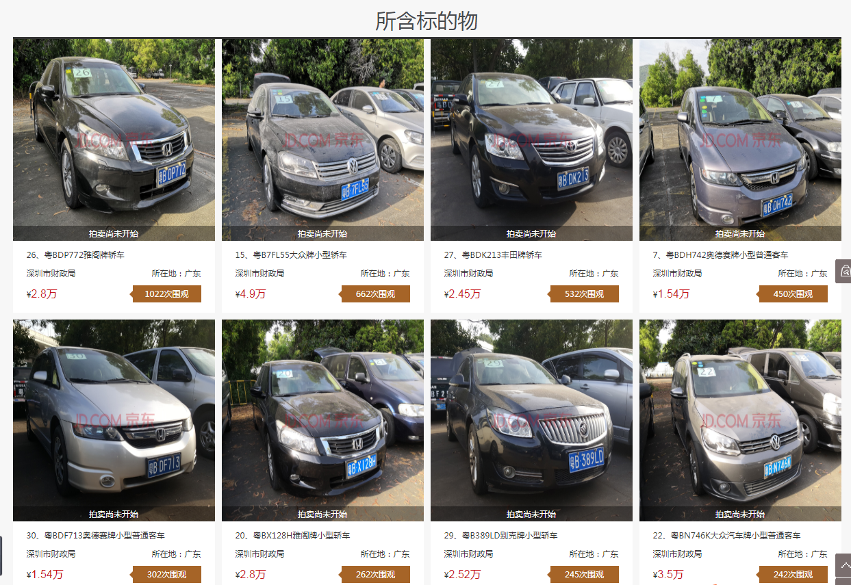 13日,晶報APP記者登錄京東網(wǎng)絡拍賣平臺,已經(jīng)可以看到這批拍賣車輛的信息。其中,第二場標的序號40(粵B327KW奧德賽牌小型普通客車)、標的序號49(粵B08566豐田牌小型轎車)已撤拍。