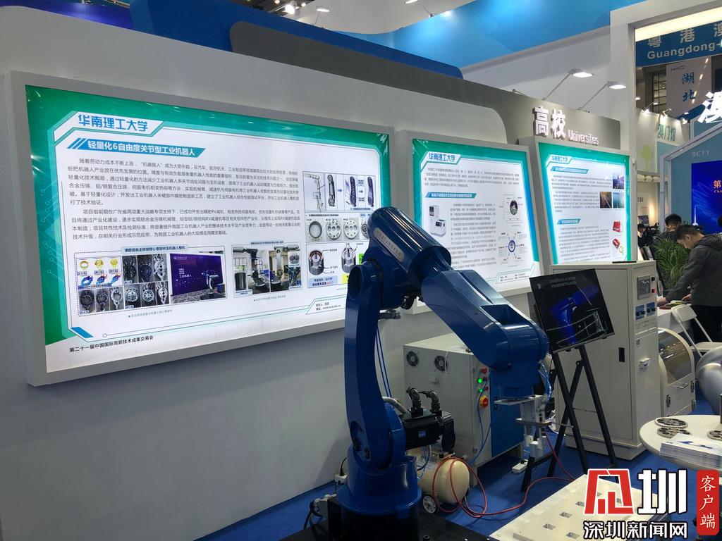 在粵港澳大灣區(qū)展示區(qū)中還有廣東省高校參展。華南理工大學的輕量化6自由度關節(jié)型工業(yè)機器人正在進行現(xiàn)場展示。