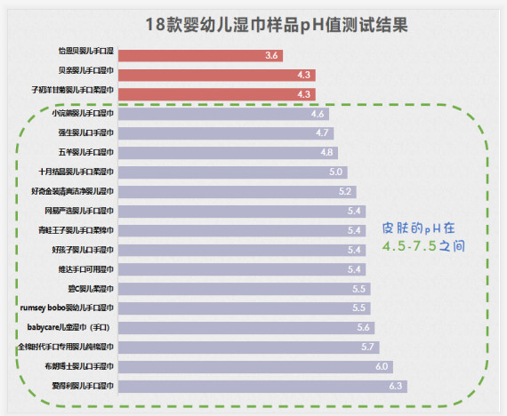 有3款樣品pH值呈偏酸性,低于皮膚的pH值(4.5-7.5),可能會傷害寶寶的皮膚。分別是怡恩貝手口濕巾、子初洋甘菊嬰兒手口柔棉巾、貝親嬰兒手口濕巾。