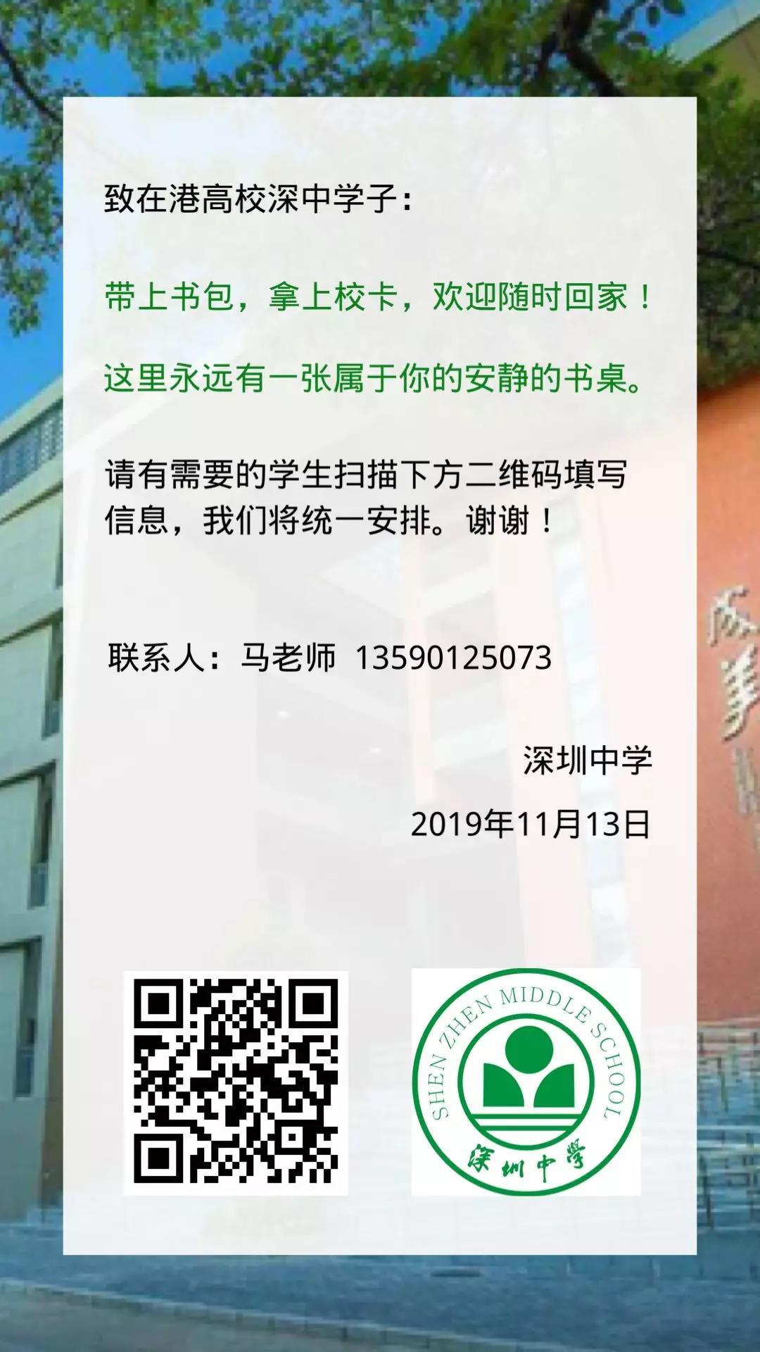 見圳客戶端·深圳新聞網(wǎng)2019年11月14日訊 繼香港中文大學(深圳)發(fā)文表示為內(nèi)地在港就讀學生提供臨時免費住宿后,深圳中學今天也在官方微信公號中致信在港高校深中學子,只要拿上校園卡,深中隨時歡迎學子們回家!學校將對有需要的學生統(tǒng)一進行安排。