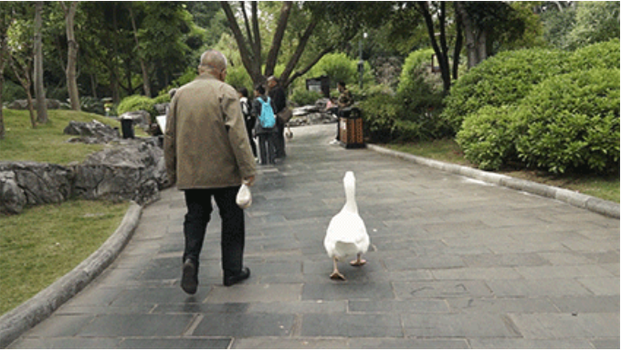 “小白”步子小但一搖一擺走得很快,不時(shí)還停下來等黃作賢。