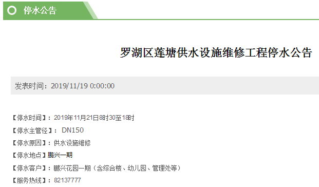 見圳客戶端·深圳新聞網(wǎng)2019年11月21日訊 據(jù)深圳市水務局消息,11月21日,福田、南山、羅湖區(qū)均有小區(qū)計劃停水,其中羅湖區(qū)鵬興花園一期從早上8時30分至下午18時停水,其它地方均在晚間。計劃停水安排如下: