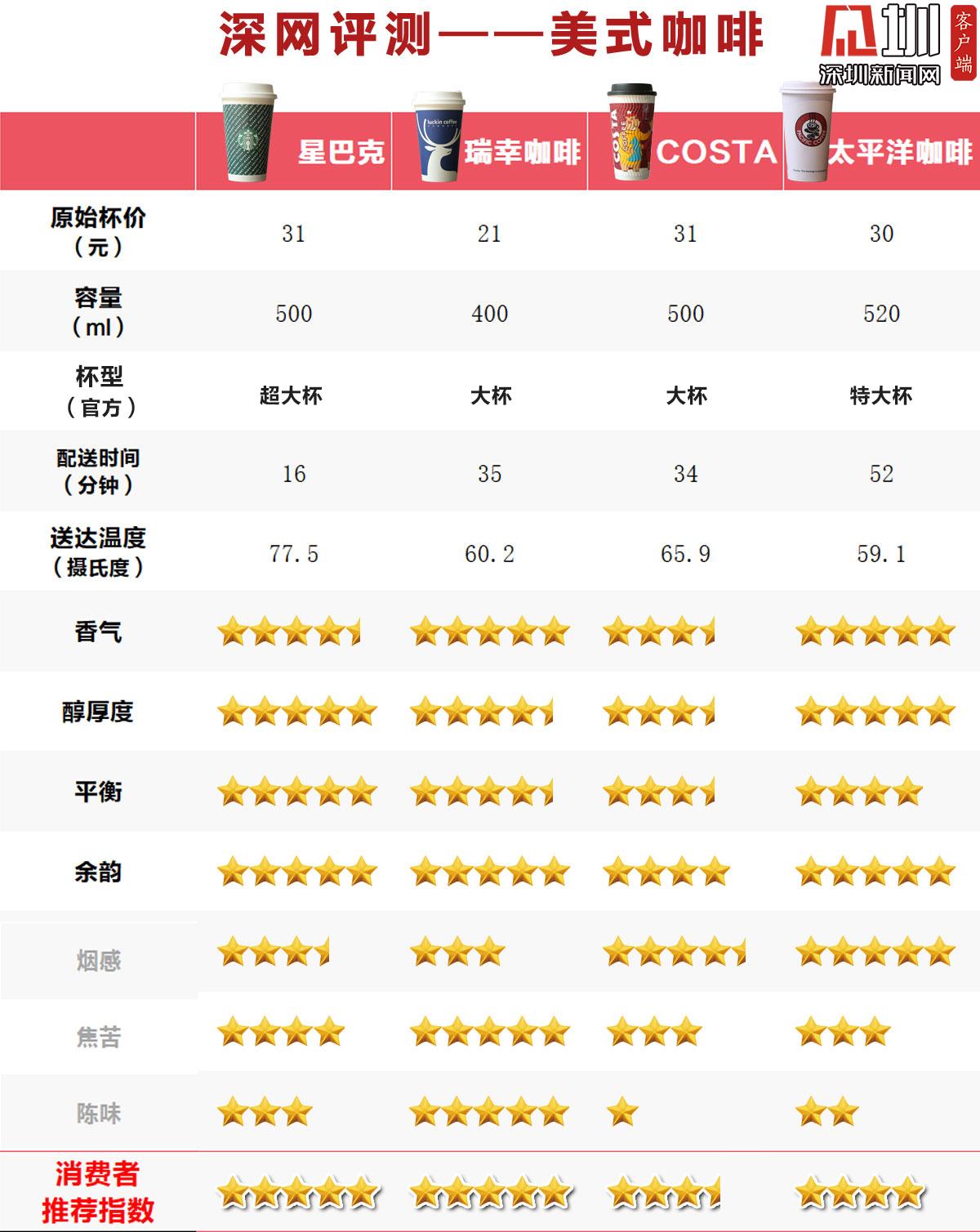 為了一探究竟,深圳新聞網(wǎng)測評小組聯(lián)合專注產(chǎn)品質(zhì)量、消費(fèi)服務(wù)專業(yè)組織中國質(zhì)量萬里行,邀請了來自新聞、餐飲、IT以及其他行業(yè)的20位咖啡愛好者,對深圳市面上主流的星巴克、瑞幸、太平洋、COSTA 4個品牌,2種口味【“拿鐵(熱)”、“美式(熱)”】的咖啡,通過主觀+客觀的形式進(jìn)行了測評。