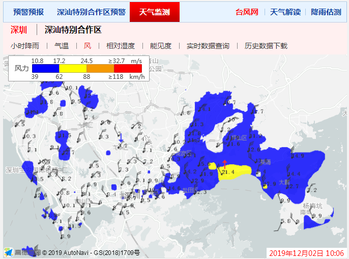 從實時的風(fēng)力圖上可以看到,龍崗區(qū)、坪山區(qū)、鹽田區(qū)、大鵬新區(qū)大部風(fēng)力在10.8m/s至17.2m/s,更有部分區(qū)域風(fēng)力達(dá)黃色預(yù)警。