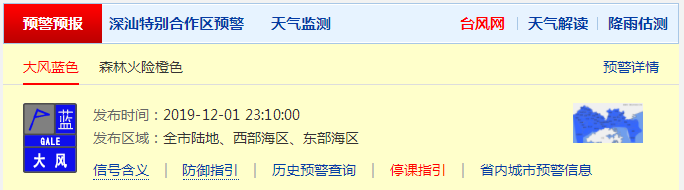深圳市氣象臺于12月1日23時10分在全市發(fā)布大風(fēng)藍(lán)色預(yù)警,預(yù)計平均風(fēng)力將達(dá)6級以上(或陣風(fēng)8級以上),目前大風(fēng)藍(lán)色預(yù)警持續(xù),今天東北風(fēng)4-5級,沿海、高地和海區(qū)陣風(fēng)7-8級。