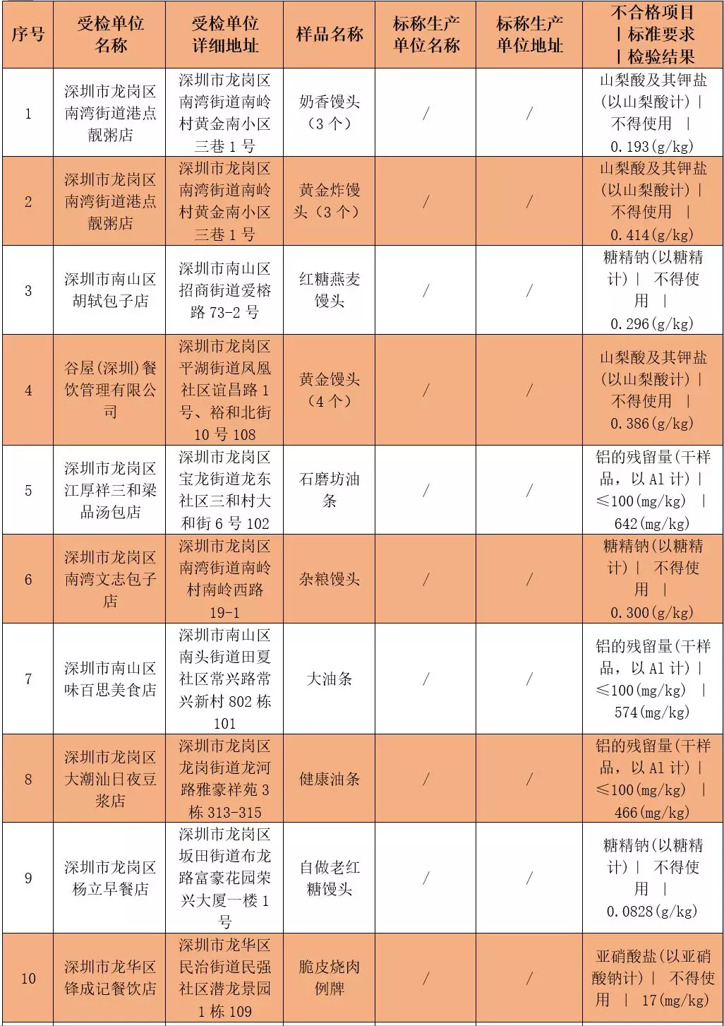 食安君最愛這個(gè)?。?/p> 正想著明早早點(diǎn)出門 買新鮮出爐熱乎的早餐來吃! 直到看到了 深圳市市場監(jiān)督管理局發(fā)布的 新一期食品抽檢通報(bào) 2019年食品安全抽樣檢驗(yàn)情況通報(bào) (第四十二期) 本次共抽檢生產(chǎn)、流通、餐飲環(huán)節(jié)食品1829批次,涉及生產(chǎn)、流通、餐飲環(huán)節(jié)經(jīng)營主體880家次,共檢測食品指標(biāo)12994項(xiàng)次。其中檢出不合格樣品18批次,涉及不合格食品類別有餐飲食品12批次,炒貨食品及堅(jiān)果制品2批次,蜂產(chǎn)品1批次,糕點(diǎn)1批次,酒類2批次;涉及不合格項(xiàng)目類別為品質(zhì)指標(biāo)、微生物污染、食品添加劑。 本次不合格食品具體信息如下 食安君發(fā)現(xiàn)