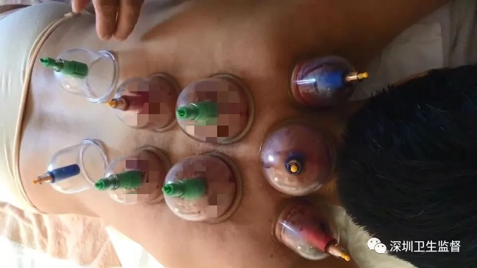 接受按摩治療的女子背后,吸了7個罐子,可與其它普通拔罐不同的是,每個罐子里,竟然都有血珠不斷溢出……