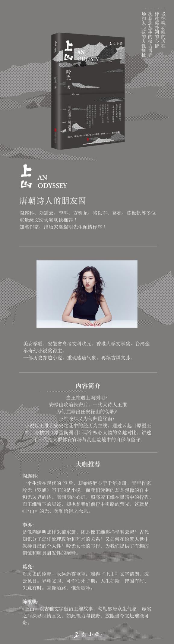 著名作家閻連科表示:“一個(gè)生活在現(xiàn)代的90后,卻始終醉心于千年史冊(cè),青年作家吟光(羅旭)寫(xiě)下的是小說(shuō),而我們讀到的卻是想像的自由和無(wú)邊界的詩(shī)。陶淵明的心燈,照亮著王維在黑暗中的行程;而王維留下的腳跡,卻也是我們前行中引路的螢光。這就是《上山》的光、美和悟得之念愿。”