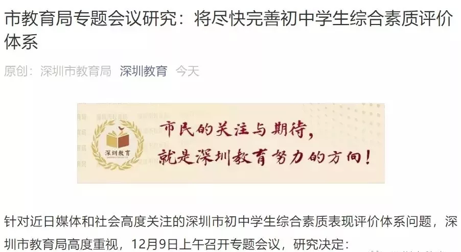 針對近日社會高度關(guān)注的深圳市初中學(xué)生綜合素質(zhì)表現(xiàn)評價體系問題,深圳市教育局于今天上午召開專題會議,并作出最新回應(yīng):將盡快完善初中學(xué)生綜合素質(zhì)評價體系。
