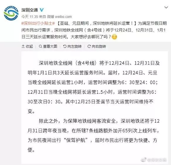 這里還要給大家插播一條交通消息。小編掐指一算,2019年馬上就要結(jié)束了,各位小伙伴是不是都開始,為新年假期做準(zhǔn)備了呢?這么重要的出去浪的機(jī)會,怎能為趕不上末班地鐵煩惱?不要緊,地鐵也延長運(yùn)營時(shí)間啦。