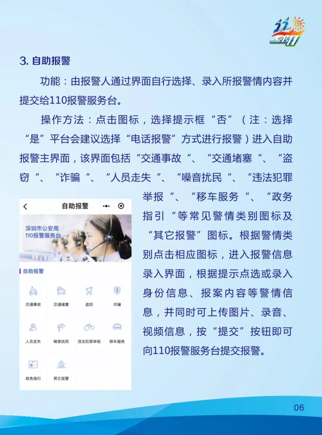 “廣東110”除了報(bào)警功能,還將上線新功能!“110宣傳日”當(dāng)天,“廣東110”報(bào)警小程序的交通事故快處快賠功能上線。還可了解到深圳交警星級(jí)用戶輕微事故遠(yuǎn)程處理系統(tǒng)相關(guān)資訊,現(xiàn)場(chǎng)教您輕松掌握交通事故快處快賠辦法。