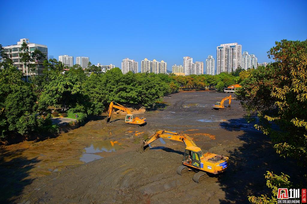 抽干東湖水后長臂挖機(jī)進(jìn)行清淤作業(yè)。