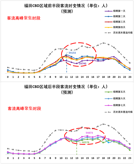 預(yù)計福田CBD區(qū)域假期間每日11:00-20:00客流量變化幅度不大,假期客流量整體低于歷史周末客流量。每日小時客流量分布如下: