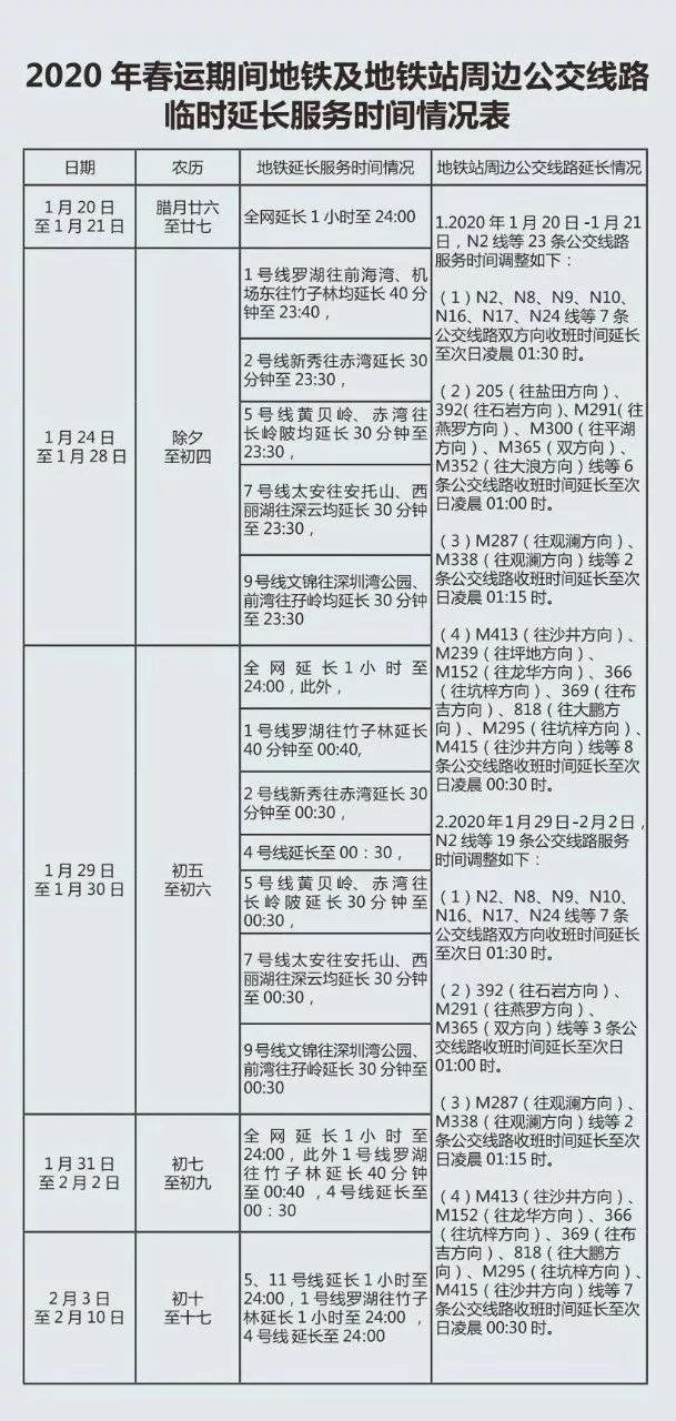 深圳地鐵全網(wǎng)及周邊公交線延時(shí)安排,