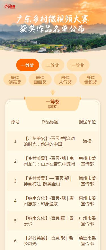 據(jù)了解,為慶祝新中國(guó)成立70周年,生動(dòng)展示黨的十八大以來(lái),廣東高舉習(xí)近平新時(shí)代中國(guó)特色社會(huì)主義思想偉大旗幟、深入推進(jìn)美麗鄉(xiāng)村建設(shè)的豐碩成果,廣東鄉(xiāng)村微視頻大賽于8月20日正式啟動(dòng)。本次微視頻大賽歷時(shí)2個(gè)多月,共征集參賽作品9375條,審核展示5996條。廣東學(xué)習(xí)平臺(tái)PC端和手機(jī)APP開設(shè)參賽作品展播專題。經(jīng)過(guò)網(wǎng)上展播和網(wǎng)絡(luò)投票,以及專家評(píng)審,評(píng)選出一等獎(jiǎng)30名,二等獎(jiǎng)100名,三等獎(jiǎng)1000名,以及最佳創(chuàng)意獎(jiǎng)、最佳畫面獎(jiǎng)、最佳人氣獎(jiǎng)各10名。佛山、廣州、惠州等10個(gè)地級(jí)以上市黨委宣傳部獲大賽組織獎(jiǎng)。