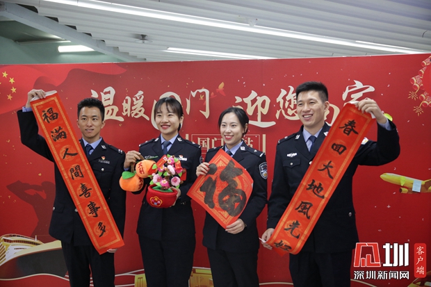 羅湖邊檢站民警喜氣洋洋拍形象宣傳照片,迎接出入境旅客回家。