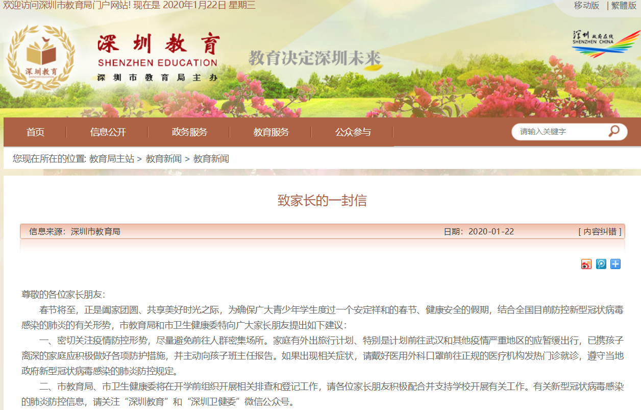 見圳客戶端·深圳新聞網(wǎng)2020年1月22日訊 1月22日,市教育局下發(fā)《深圳市教育系統(tǒng)新型冠狀病毒感染的肺炎疫情防控工作方案》的通知,引導(dǎo)師生假期盡量不要前往武漢和疫情嚴(yán)重地區(qū),并要求校外培訓(xùn)機(jī)構(gòu)即日起全面停止春節(jié)假期補(bǔ)課。