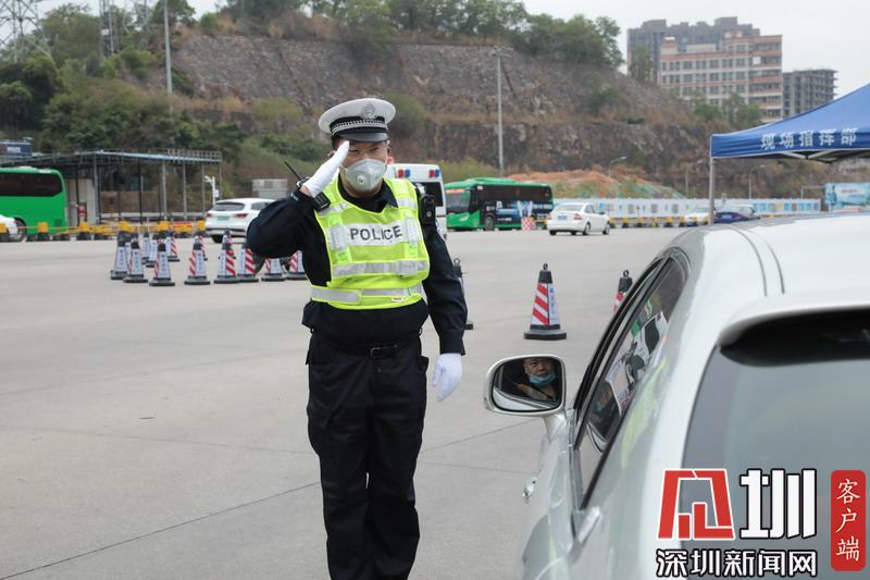 深圳交警民警向往來車輛司機(jī)敬禮致意。