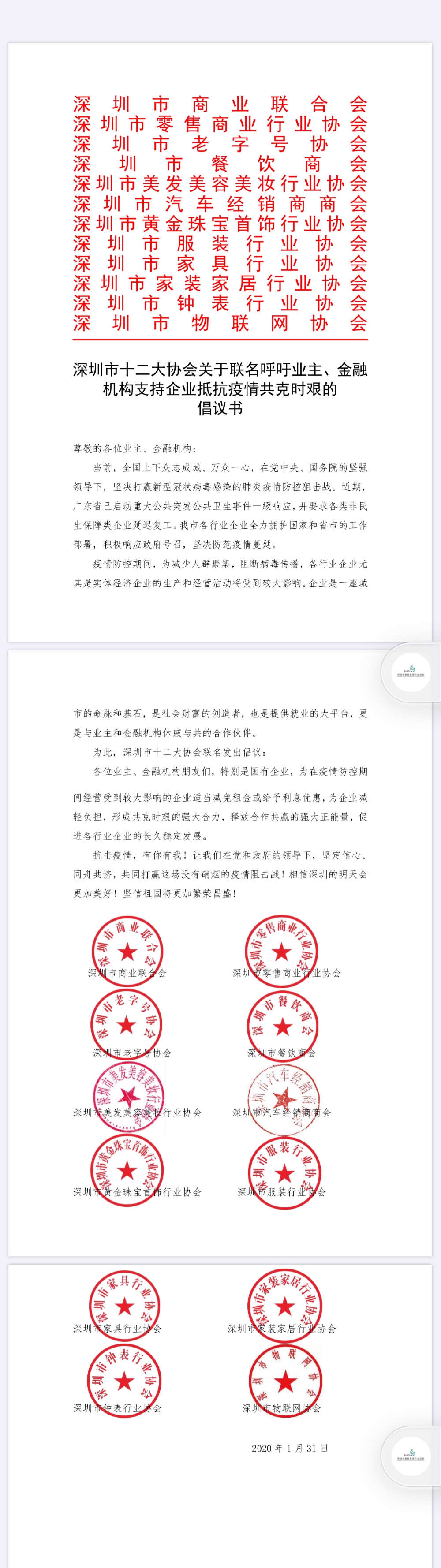 見圳客戶端·深圳新聞網(wǎng)2020年2月1日訊(見圳客戶端、深圳新聞網(wǎng)記者 金洪竹)1月31日深夜,一份特別的倡議書在網(wǎng)絡(luò)熱傳。深圳市商業(yè)聯(lián)合會、深圳市零售商業(yè)行業(yè)協(xié)會、深圳老字號協(xié)會、深圳市餐飲商會、深圳市美發(fā)美容美妝行業(yè)協(xié)會、深圳市汽車經(jīng)銷商協(xié)會、深圳市黃金珠寶首飾行業(yè)協(xié)會、深圳市服裝行業(yè)協(xié)會、深圳市家具行業(yè)協(xié)會、深圳市家裝家居行業(yè)協(xié)會、深圳市鐘表行業(yè)協(xié)會和深圳市物聯(lián)網(wǎng)協(xié)會等12家商協(xié)會發(fā)出聯(lián)名倡議,呼吁業(yè)主、金融機構(gòu)支持企業(yè)抵抗疫情、共克時艱。