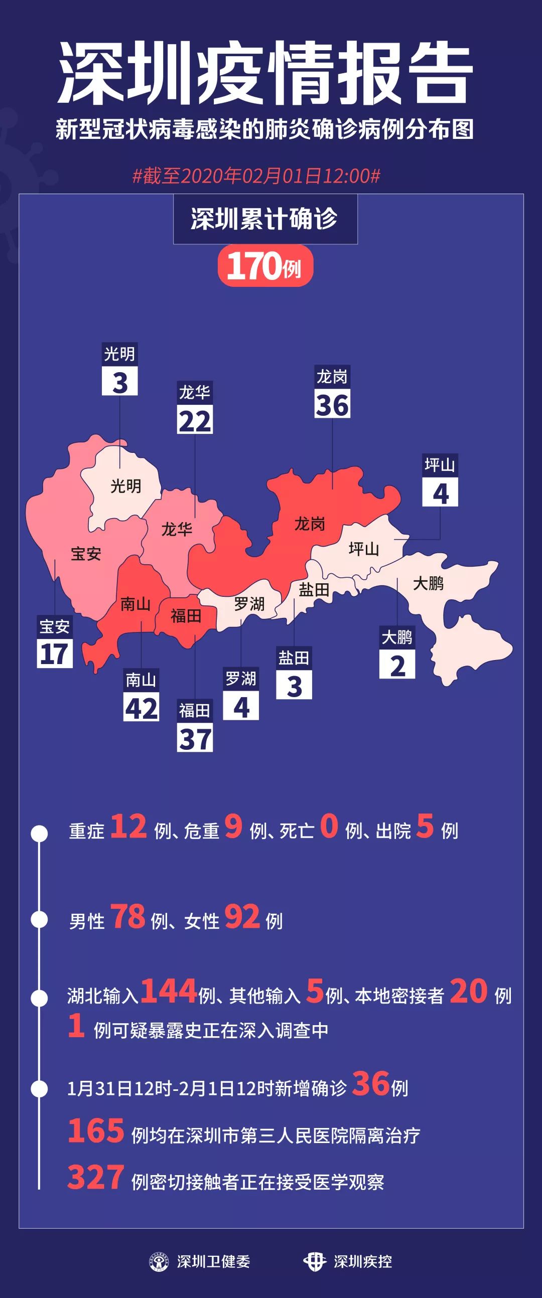 深圳病人糞便中檢出病毒陽性 2月1日晚,深圳市第三人民醫(yī)院透露,該院肝病研究所發(fā)現(xiàn),在某些新型冠狀病毒感染的肺炎確診患者的糞便中檢測出2019-nCoV核酸(新型冠狀病毒)陽性,很有可能提示糞便中有活病毒存在。目前研究人員正在做進一步分離病毒的研究。 此外,國際醫(yī)學期刊《新英格蘭醫(yī)學雜志》最新刊登的一篇文章也透露,醫(yī)生們在美國首位“新型肺炎”病人的腹瀉糞便樣本中檢測出了新型冠狀病毒的存在(rRT-PCR結果陽性)。 在此提醒市民,一定要更加注意勤洗手,尤其是便后、飯前,一定要用流水+肥皂或洗手液,洗手20秒以上。 1月31日12時至2月1日12時,深圳新增36個確診病例 病例135 47歲女性患者,常住北京。1月15日前往武漢探親,22日乘私家車前往深圳。1月23日發(fā)病,1月27日入院,目前情況穩(wěn)定。 病例136 病例98的女兒 4歲女性患者,常住湖北省十堰市。在密切接觸者采樣檢測中,發(fā)現(xiàn)新型冠狀病毒陽性,故于1月27日入院,目前情況穩(wěn)定。 病例97:64歲男性患者,常住于湖北省十堰市。2020年1月22日抵達深圳,24日發(fā)病,26日入院就診。 病例98(病例97的兒子):40歲男性患者,常住于深圳市龍崗區(qū)。2020年1月22日,父親從湖北抵達深圳,24日發(fā)病,26日入院就診。 病例137 56歲男性患者,常住湖北省武漢市。1月21號前往深圳。1月26日發(fā)病,1月28日入院,目前情況穩(wěn)定。 病例138 59歲男性患者,常住深圳市龍華區(qū)。1月16日自駕從深圳前往武漢,1月23日開車回到深圳。1月26日發(fā)病,當日入院,目前情況穩(wěn)定。 病例139 病例138妻子 57歲女性患者,常住深圳市龍華區(qū)。1月16日自駕深圳前往武漢,1月23日開車回到深圳。1月24日發(fā)病,1月26日入院,目前情況穩(wěn)定。 病例140 66歲女性患者,常住湖北省武漢市。1月22日前往深圳。1月23日發(fā)病,1月28日入院,目前情況穩(wěn)定。 病例141 78歲男性患者,常住湖北省武漢市。1月16日前往深圳探親。1月26日發(fā)病,1月27日入院,目前情況穩(wěn)定。 病例142 61歲女性患者,常住湖北省武漢市。1月21日前往深圳探親。1月22日發(fā)病,1月28日入院,目前情況穩(wěn)定。 病例143 54歲男性患者,常住深圳市南山區(qū)。1月21日前往武漢,23日返回深圳。1月25日發(fā)病,1月28日入院,目前情況穩(wěn)定。 病例144 55歲女性患者,常住深圳市南山區(qū)。1月21日由深圳前往武漢,23日返回深圳。1月24日發(fā)病,1月29日入院,目前情況穩(wěn)定。 病例145 57歲女性患者,常住深圳市南山區(qū)。1月13日從深圳到武漢探親,1月23日從武漢自駕返回深圳。1月26日發(fā)病,1月27日入院,目前情況穩(wěn)定。 病例146 病例29父親 76歲男性患者,常住湖北省武漢市。1月15日從武漢出發(fā)前往廣西南寧旅游,1月18日從廣西南寧出發(fā)前往深圳探親。1月27日發(fā)病,1月28日入院,目前情況穩(wěn)定。 病例29:49歲女性患者,長期居住湖北武漢,2020年1月15日從武漢到廣西南寧,18日從南寧到佛山,20日從佛山抵達深圳,21日發(fā)病,22日入院就診。 病例147 病例105的女兒 6歲女性患者,常住深圳市羅湖區(qū)。1月12日前往武漢,1月22日乘私家車前往河南信陽,23日乘私家車前往深圳。在密切接觸者采樣檢測中發(fā)現(xiàn),新型冠狀病毒陽性,故于1月28日入院,目前情況穩(wěn)定。 病例105:35歲男性患者,常住于深圳市羅湖區(qū)。2020年1月17日自駕車由深圳開往武漢,22日自駕車從武漢開往河南信陽探親,23日自駕車從河南信陽開往深圳,當日發(fā)病,25日入院就診。 病例106(病例105妻子):36歲女性患者,常住于深圳市羅湖區(qū)。2020年1月17日乘私家車由深圳到武漢,22日乘私家車從武漢到河南信陽探親,23日乘私家車從河南信陽到深圳,24日發(fā)病,25日入院就診。 病例107(病例105丈母娘):61歲女性患者,常住于深圳市羅湖區(qū)。1月12日從深圳前往武漢,22日乘私家車從武漢到河南信陽探親,23日乘私家車從河南信陽到深圳,24日發(fā)病,25日入院就診。 病例148 38歲女性患者,常住深圳市福田區(qū)。1月23日接觸從武漢來深的父母(都未確診)。1月27日發(fā)病,當日入院,目前情況穩(wěn)定。 病例149 33歲女性患者,常住深圳市福田區(qū)。1月19日前往武漢,乘私家車到潛江探親,1月24日乘私家車返回深圳。1月28日發(fā)病,當日入院,目前情況穩(wěn)定。 病例150 49歲男性患者,常住深圳市龍華區(qū)。1月18日前往武漢探親,1月23日回到深圳。1月25日發(fā)病,1月27日入院,目前情況穩(wěn)定。 病例151 病例150的女兒 18歲女性患者,常住深圳市龍華區(qū)。1月18日前往武漢探親,1月23日回到深圳。1月25日發(fā)病,1月29日入院,目前情況穩(wěn)定。 病例152 56歲女性患者,常住江蘇省南京市。1月21日乘私家車到武漢,1月22日前往深圳。1月26日發(fā)病,當日入院,目前情況穩(wěn)定。 病例153 病例84的丈夫 58歲男性患者,常住深圳市龍華區(qū)。在密切接觸者采樣檢測中發(fā)現(xiàn),新型冠狀病毒陽性,故于1月29日入院,目前情況穩(wěn)定。 病例84:52歲女性患者,常住深圳市龍華區(qū)。2020年1月19日至22日在武漢,22日-23日從武漢到仙桃市探親,23日發(fā)病,24日駕車至長沙,25日從長沙抵達深圳后入院就診。 病例154 病例114的妻子 34歲女性患者,常住深圳市龍華區(qū)。1月22日前往湖南省冷水江市,1月27日返回深圳。1月26日發(fā)病,1月28日入院,目前情況穩(wěn)定。 病例114