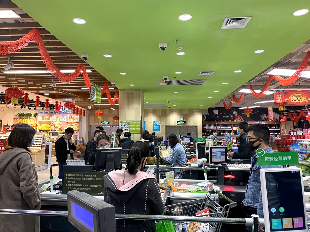 與寂寥的街道相映成趣的是商場內(nèi)排隊(duì)購買果蔬的市民