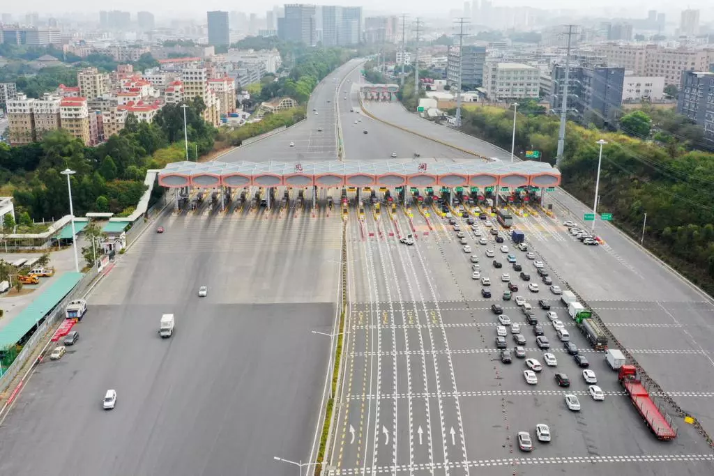 梅觀高速觀瀾收費(fèi)站,入深方向的車輛排隊(duì)依次接受檢查。