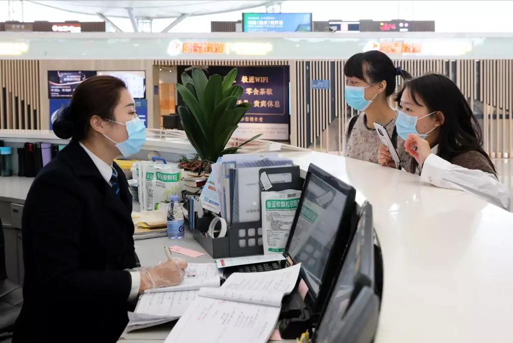 在機(jī)場(chǎng)檢疫站旁,醫(yī)務(wù)人員對(duì)旅客進(jìn)行詢問和醫(yī)學(xué)健康篩查。