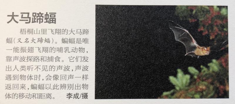 “我是在梧桐山附近仙湖植物園拍到的大馬蹄蝠。每到傍晚,仙湖植物園進(jìn)出園區(qū)的那條路上,都有數(shù)量比較多的大馬蹄蝠在那飛。當(dāng)時(shí)有幾棵樹在開花,我拍了好幾張終于抓拍到一張清晰的?!?月4日,李成在回憶當(dāng)年拍攝經(jīng)歷時(shí)說,當(dāng)時(shí)蝙蝠群距離他最近的有2-3米,最遠(yuǎn)的有10多米。