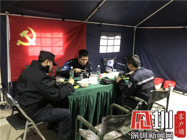 大鵬公安分局機(jī)訓(xùn)大隊(duì)的隊(duì)員們?cè)趲づ駜?nèi)用午餐