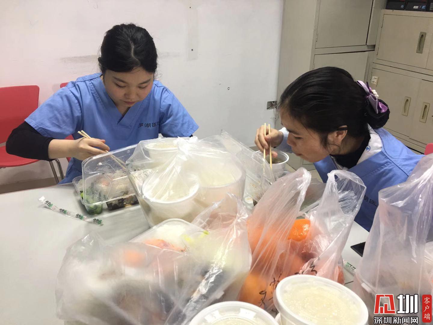 2020年2月6日,正在用午餐的羅湖區(qū)人民醫(yī)院發(fā)熱門(mén)診醫(yī)護(hù)人員。因?yàn)樾滦凸跔畈《靖腥镜姆窝滓咔樾蝿?shì)嚴(yán)峻,醫(yī)護(hù)人員由以往的到食堂吃飯,改為現(xiàn)在將飯統(tǒng)一領(lǐng)回到辦公區(qū),大家到辦公室分餐吃。為避免集中用餐,改為分批輪流吃飯。(見(jiàn)圳客戶(hù)端、深圳新聞網(wǎng)記者彭桂紅)