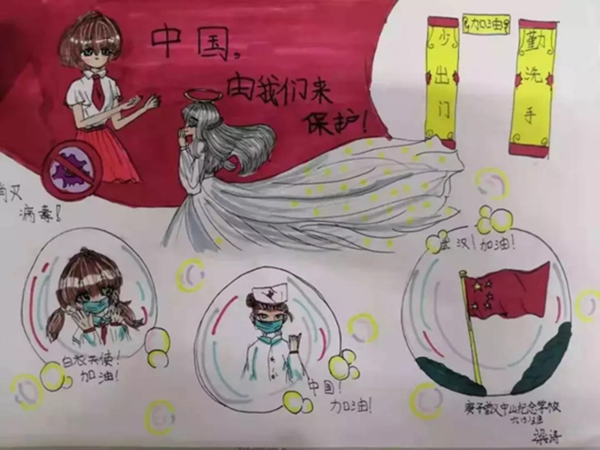 一(1)中隊的張明堯、四(6)中隊的劉晨希等同學(xué)用繪制手抄報的形式詮釋“預(yù)防新型冠狀病毒感染的肺炎,從我做起”。