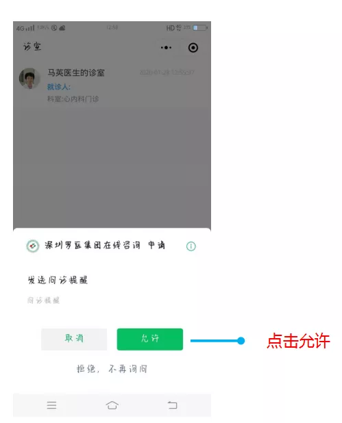 首次進(jìn)入診室,需要授權(quán)發(fā)送問診提醒