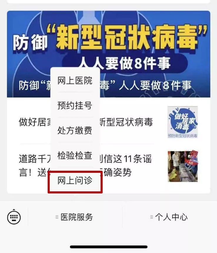 ①關(guān)注“深圳羅湖區(qū)人民醫(yī)院”的公眾號,點擊左下角菜單“醫(yī)院服務(wù)”→“網(wǎng)上問診”