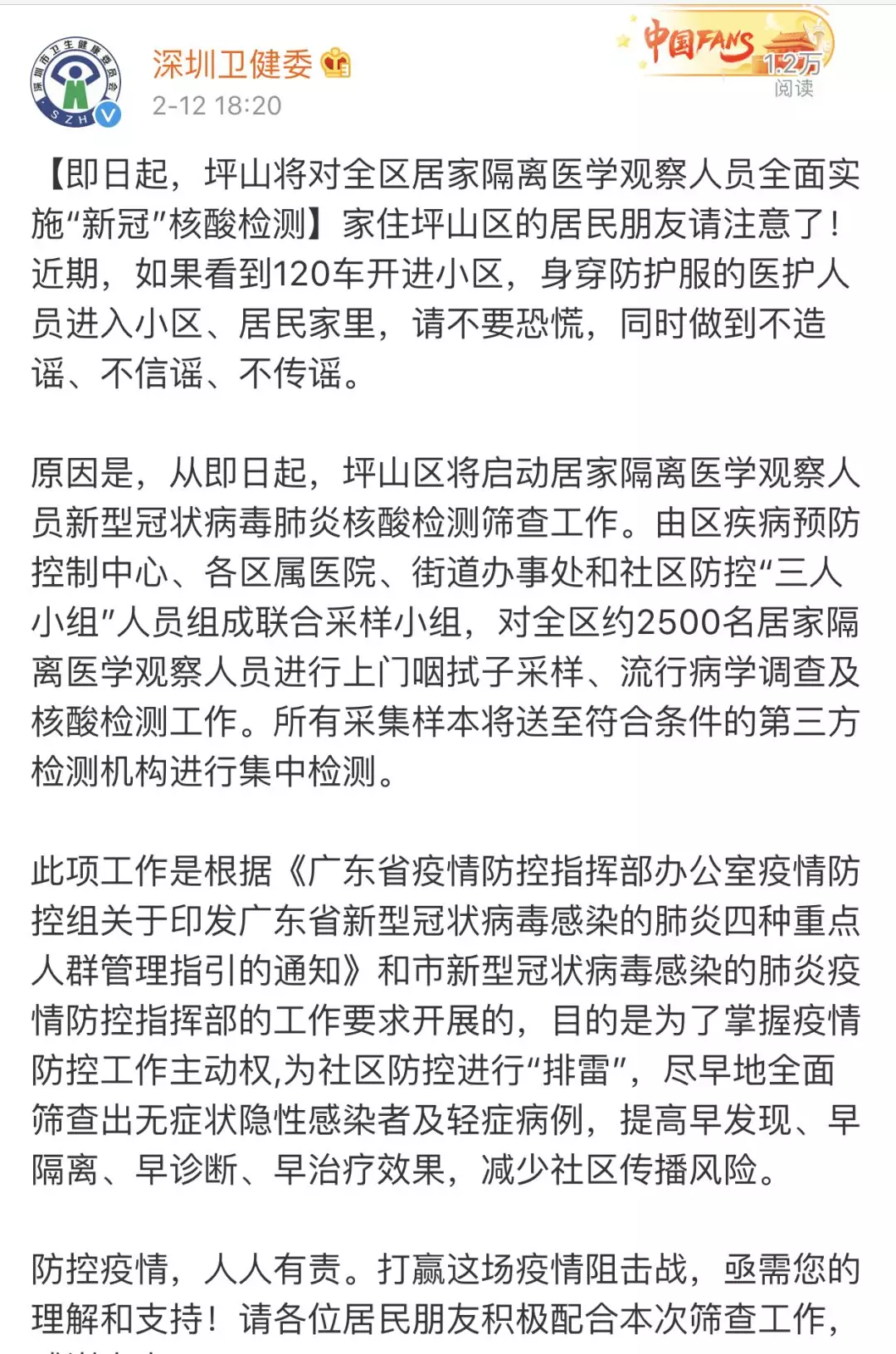 為防范新冠病毒感染疫情的社區(qū)傳播,切實(shí)做到早發(fā)現(xiàn)、早隔離、早診斷、早治療,2月12日起,深圳各區(qū)(新區(qū))均為所有居家隔離醫(yī)學(xué)觀察人員檢測新型冠狀病毒核酸。