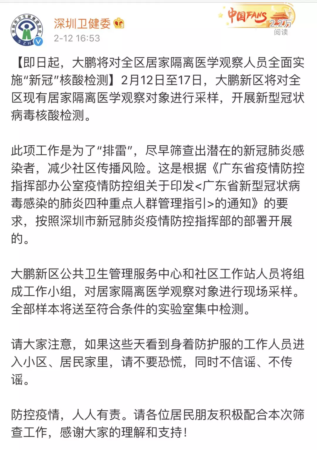 徹底“排雷”!深圳免費(fèi)為所有居家隔離者檢測(cè)“新冠”病毒核酸