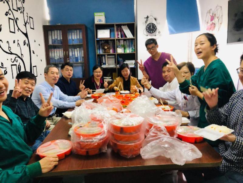 20:40,院領(lǐng)導(dǎo)和專家剛剛討論會診結(jié)束,病房同事也剛剛完成輪換交接。配餐室突然多了好多人,大家好像約好的似的,都不愿意回去自己過年。我們相聚一起,不分上下級,我們只是一群同事(其實,劉映霞副院長也在)一起吃除夕工作餐,一起過大年。