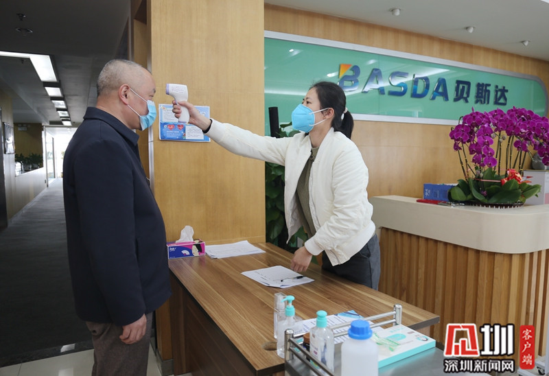 深圳貝斯達公司員工為進出人員測量體溫。