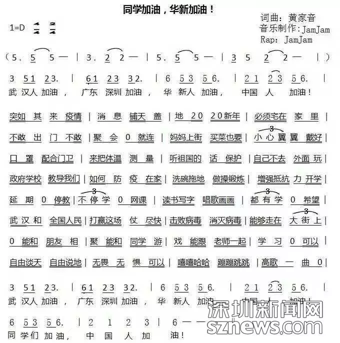 開(kāi)學(xué)首日,深圳市福田區(qū)華新小學(xué)音樂(lè)教師黃家音作詞作曲《同學(xué)加油華新加油》祝福武漢,叮囑同學(xué)。