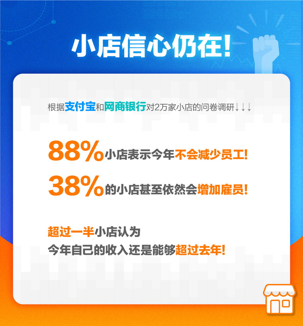 根據(jù)支付寶和網(wǎng)商銀行對20000家小店的問卷調(diào)研,88%小店表示,今年不會減少員工,38%的小店表示,依然會增加雇員;超過一半小店認為今年自己的收入還是能夠超過去年。
