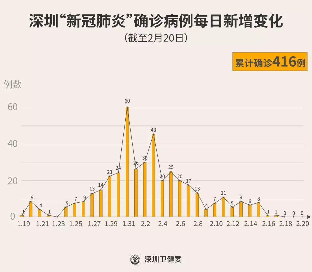 截至2月20日24時,深圳累計(jì)報告“新冠肺炎”確診病例416例。2月20日當(dāng)天全市無新增確診病例。