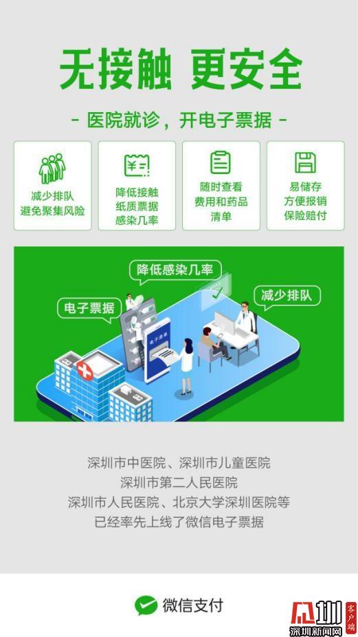 見(jiàn)圳客戶端·深圳新聞網(wǎng)2020年2月24日訊(見(jiàn)圳客戶端、深圳新聞網(wǎng)記者 陳婕)減少接觸是對(duì)抗擊疫情的最大支持。日前,微信聯(lián)合博思軟件在深圳市中醫(yī)院、深圳市兒童醫(yī)院、深圳市第二人民醫(yī)院、深圳市人民醫(yī)院、北京大學(xué)深圳醫(yī)院等醫(yī)院首期上線了醫(yī)療電子票據(jù),為患者提供“就診繳費(fèi)后通過(guò)微信領(lǐng)取電子票據(jù)”的服務(wù),減少接觸人群聚集及紙質(zhì)票據(jù)交叉感染的風(fēng)險(xiǎn)。