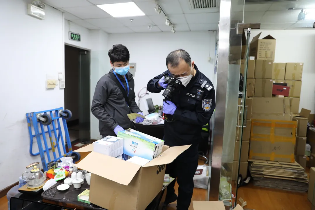(刑警大隊(duì)民警對(duì)查獲的偽劣口罩拍照取證)