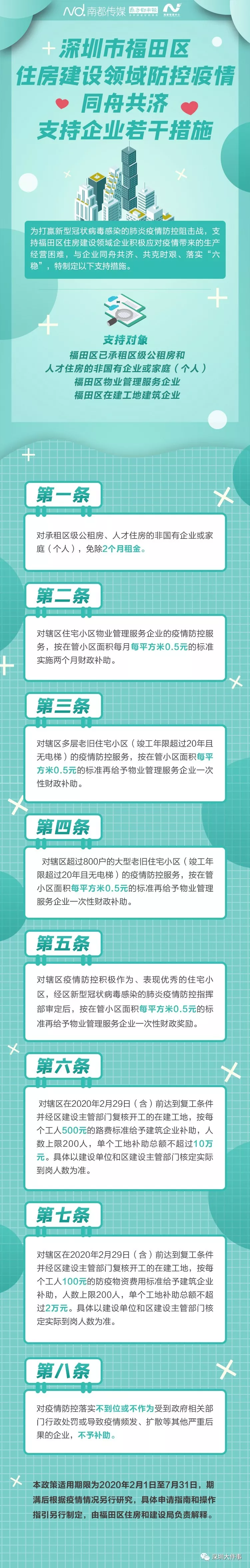 自深圳發(fā)布16條措施支持企業(yè)后,2月18日,福田區(qū)住房和建設(shè)局印發(fā)《深圳市福田區(qū)住房建設(shè)領(lǐng)域防控疫情同舟共濟(jì)支持企業(yè)若干措施》(下稱《福田住建支持企業(yè)措施》)的通知,推出8條支持措施,以支持福田區(qū)住房建設(shè)領(lǐng)域企業(yè)積極應(yīng)對疫情帶來的生產(chǎn)經(jīng)營困難。