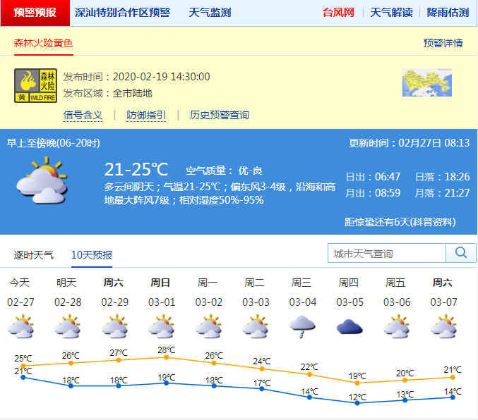 27日多云,早晨有輕霧,氣溫18-25℃,沿海及高地最大陣風(fēng)6-7級;28日至3月3日多云為主,氣溫小幅波動,早晚有輕霧,偶有零星小雨;4日冷空氣影響,北風(fēng)加大,有小雨,氣溫明顯下降。森林火險黃色預(yù)警持續(xù)生效中,請注意家庭用火、用電安全。