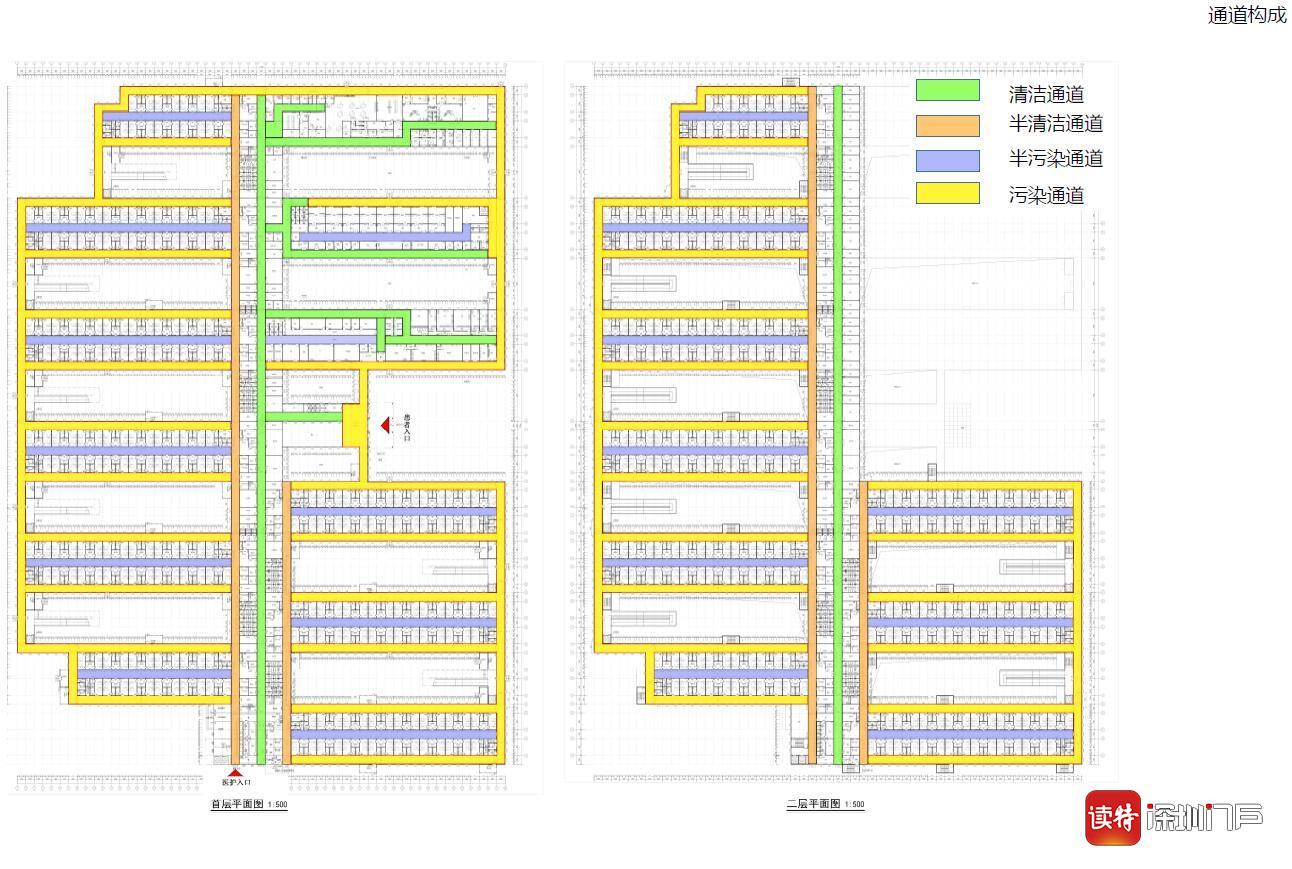 據了解,應急醫(yī)院采用更加嚴格的“四區(qū)三通道”布局,分為清潔區(qū)、半清潔區(qū)、半污染區(qū)、污染區(qū)、清潔通道、半清潔通道、污染通道。