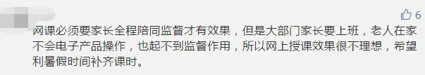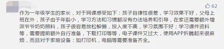 雖然網(wǎng)課兩端是老師和學(xué)生,但家長的參與也必不可少。部分參與者認(rèn)為,如果沒有家長的有效監(jiān)管,網(wǎng)課很難保證教學(xué)質(zhì)量,而大部分家長已經(jīng)復(fù)工,無法時(shí)刻盯著孩子。有些家長晚上下班后還要監(jiān)督孩子上網(wǎng)課、做作業(yè),實(shí)在“費(fèi)時(shí)、費(fèi)力、費(fèi)神”。讓孩子自己上網(wǎng)課,有些“連作業(yè)是什么都不清楚”。還有些孩子利用上網(wǎng)課的空檔玩游戲,甚至“從十七號(hào)開始到現(xiàn)在玩游戲超過1萬塊”。