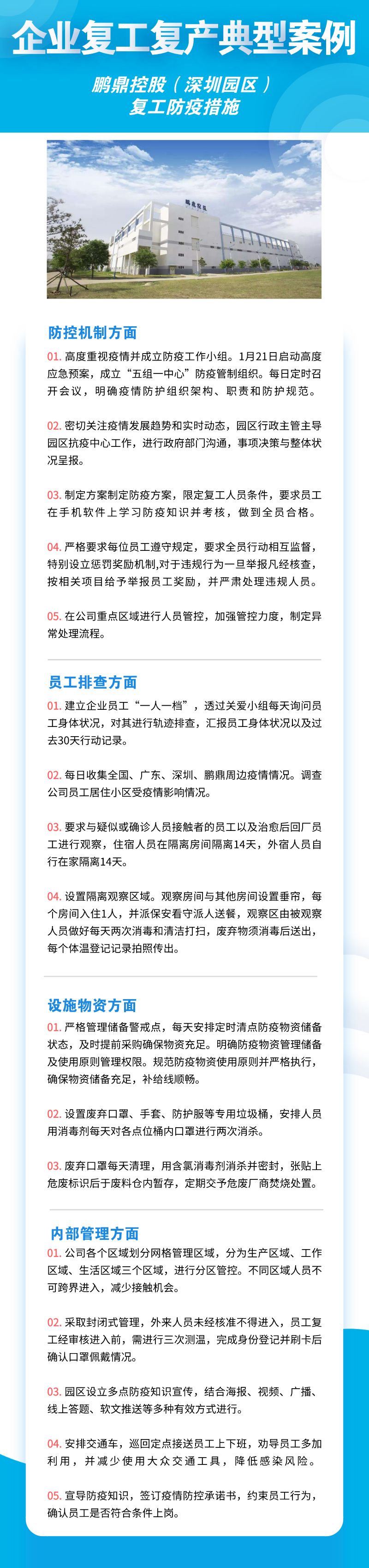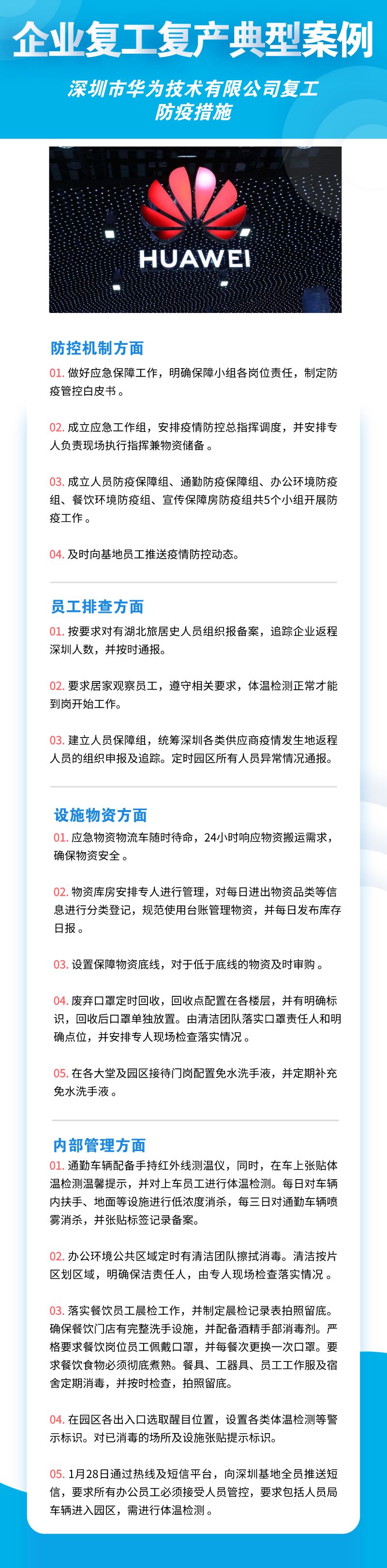 深圳市華為技術有限公司、聯(lián)想系統(tǒng)集成(深圳)有限公司、深南電路股份有限公司、比亞迪股份有限公司、創(chuàng)維集團股份有限公司等8家公司,從防控機制、員工排查、設施物資、內部管理四個方面來落實疫情防控措施,包括成立企業(yè)疫情防控小組、建立企業(yè)防控機制、提升員工防控意識、劃分隔離區(qū)域、宿舍食堂等區(qū)域消殺等舉措。