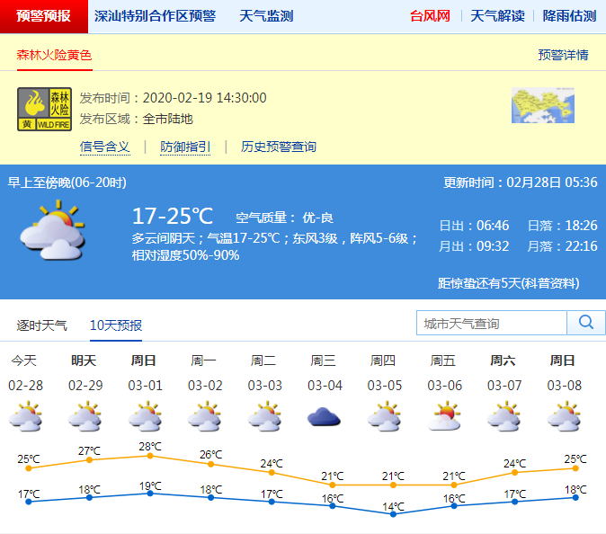 見圳客戶端·深圳新聞網(wǎng)2020年2月28日訊 深圳市氣象臺預(yù)計,27日晚到28日,深圳陰天間多云,氣溫18-25 ℃,相對濕度50%-95%,東風(fēng)3-4級,沿海、高地和海區(qū)陣風(fēng)可達7級;29日至3月3日多云為主,天氣總體溫暖,氣溫小幅波動,早晚有輕霧,偶有零星小雨;4日 -5日受冷空氣影響,氣溫明顯下降,其中4日有零星小雨。