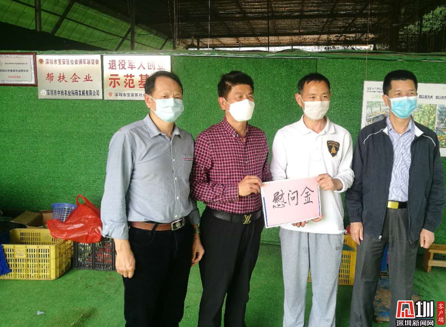 2月22日下午,寶安區(qū)退役軍人事務(wù)局局長(zhǎng)劉偉、 寶安 區(qū)社會(huì)擁軍聯(lián)誼會(huì)會(huì)長(zhǎng)李新華, 以及匯駿豐資產(chǎn)管理有限公司黨支部代表等人 , 專(zhuān)門(mén)驅(qū)車(chē)前往深圳市中樺農(nóng)業(yè)科研發(fā)展有限公司位于寶安區(qū)燕羅街道的蔬菜基地,慰問(wèn)該公司員工并送上慰問(wèn)金。