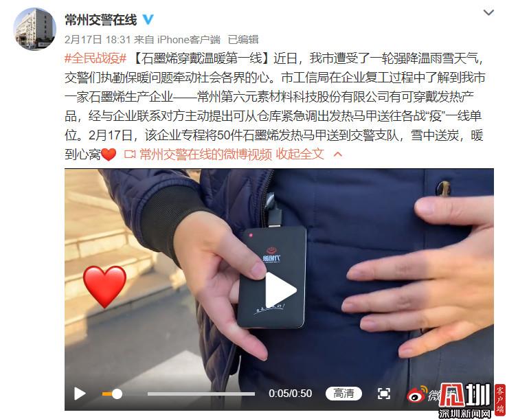 2月18日,一場(chǎng)大雪降臨常州,風(fēng)大雪大溫度低,常州各單位一線(xiàn)工作者堅(jiān)守崗位,一如既往地扎實(shí)做好疫情防控工作。烯旺科技聯(lián)合兄弟企業(yè)常州第六元素向奮斗中在抗疫中執(zhí)勤一線(xiàn)的常州交警支隊(duì),惠山區(qū)公安局、惠山經(jīng)濟(jì)開(kāi)發(fā)區(qū)執(zhí)勤人員捐贈(zèng)共計(jì)160件純石墨烯發(fā)熱馬甲,價(jià)值23.7萬(wàn)元,以此向一線(xiàn)工作者送去溫暖,并致以崇高的敬意。
